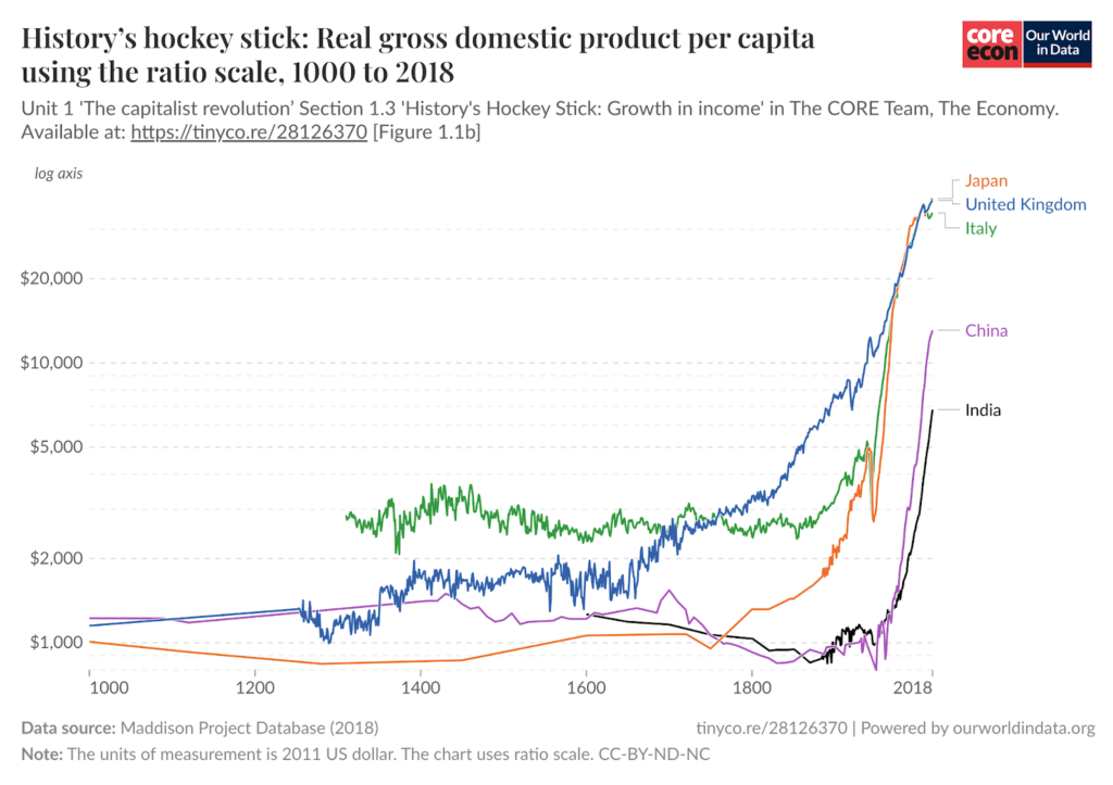 Unit 1 ‘The capitalist revolution’ Section 1.3 ‘History’s Hockey Stick: Growth in income’ in The CORE Team, The Economy. Available at: https://tinyco.re/28126370 [Figure 1.1b]